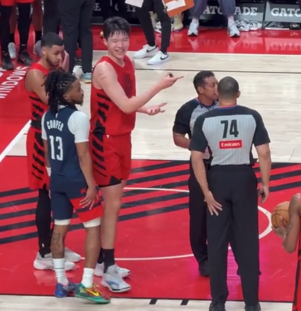 03月31日讯 30日NBA常规赛,开拓者123-88大胜奇才,杨瀚森在比赛最后33秒被朱利安·里斯架着拖走,微笑摊手抗议,结果裁判吹了双方技犯。